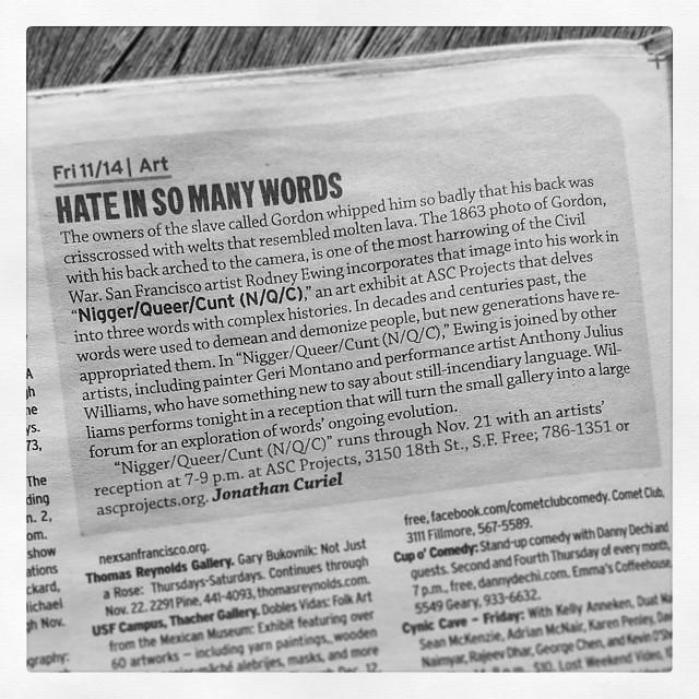 10689683_797297380327339_6990550654195671105_n Published November 12, 2015 at 640 × 640 in Nigger / Queer / Cunt: an exhibition about difficult word Next → SF Weekly